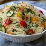 A light and refreshing Angel Hair Pasta Salad featuring delicate angel hair pasta combined with fresh cherry tomatoes, black olives, shredded carrots, and red bell pepper, all tossed in flavorful Italian dressing and topped with grated Parmesan cheese. Perfect as a quick side dish or a light meal, this salad is simple to prepare and served chilled for optimum taste.