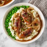 - Serve: Serve the sausages and onion gravy over a bed of creamy mashed potatoes, accompanied by peas on the side for a complete meal.