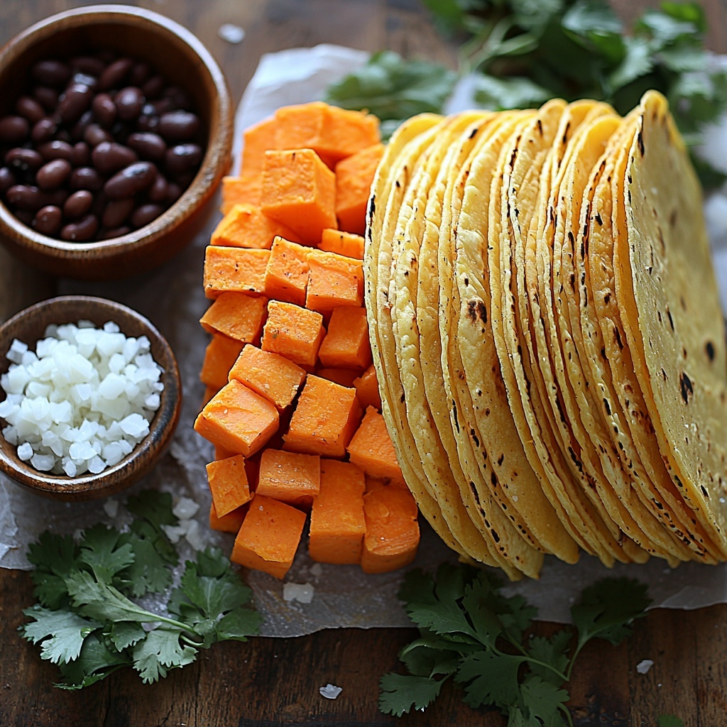 - Assemble Tacos: Fill each warmed tortilla with approximately 2 tablespoons of refried black beans and an equal portion of the sweet potato and onion mixture. Sprinkle with Monterey Jack cheese and garnish with freshly chopped cilantro.