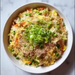 - Season and Garnish: Season with salt and pepper to taste. Toss in chopped green onions for freshness and optionally garnish with sesame seeds before serving.
