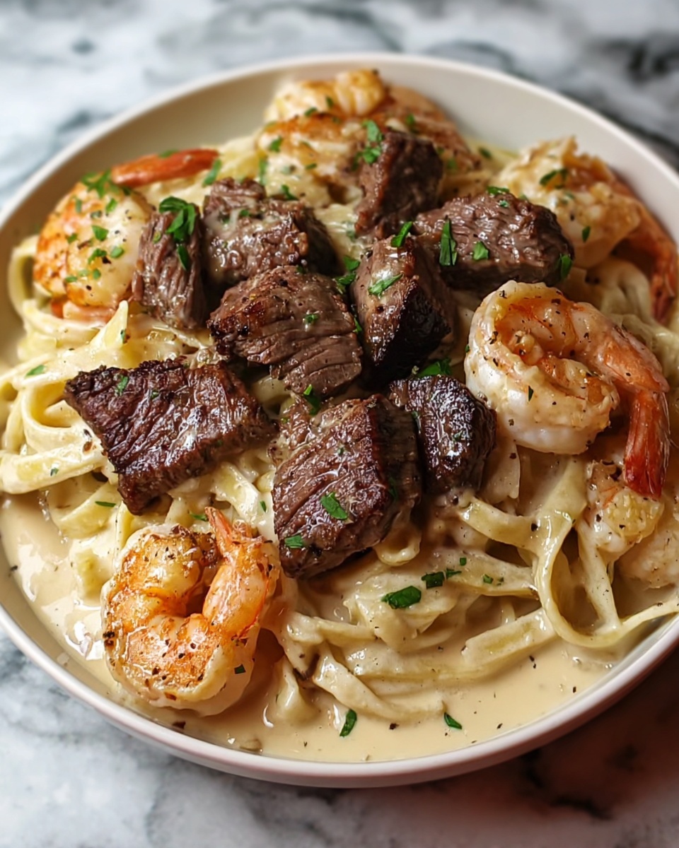 For a dinner party wow factor, serve the pasta in individual shallow bowls with the steak and shrimp artfully arranged on top. Garnish with a few lemon wedges for a fresh zest that your guests can squeeze over their plates, adding a bright twist to cut through the creaminess.