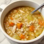 Hearty and comforting Chicken Barley Soup made with tender shredded chicken, wholesome barley, and fresh vegetables simmered in a flavorful chicken stock seasoned with herbs and spices. This easy-to-make soup is perfect for a nourishing lunch or dinner and serves 6 people.