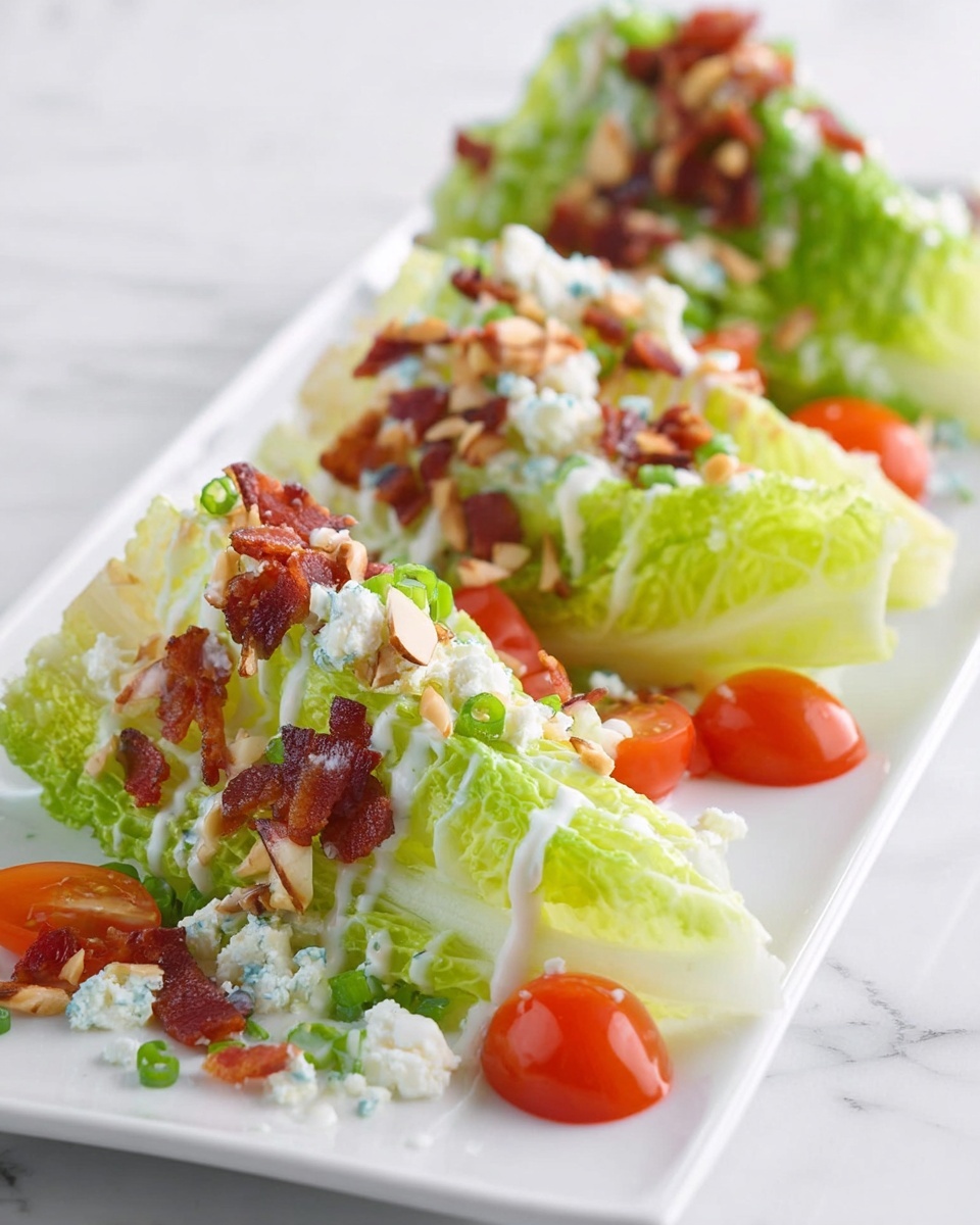 Arrange each lettuce wedge on a serving platter or individual plates. Generously drizzle the creamy blue cheese dressing over the wedges, letting it cascade down the layers. Then sprinkle cooked bacon, quartered cherry tomatoes, pecans, crumbled blue cheese, and sliced green onions all over. The toppings bring color, texture, and bursts of flavor that make each forkful a delight.