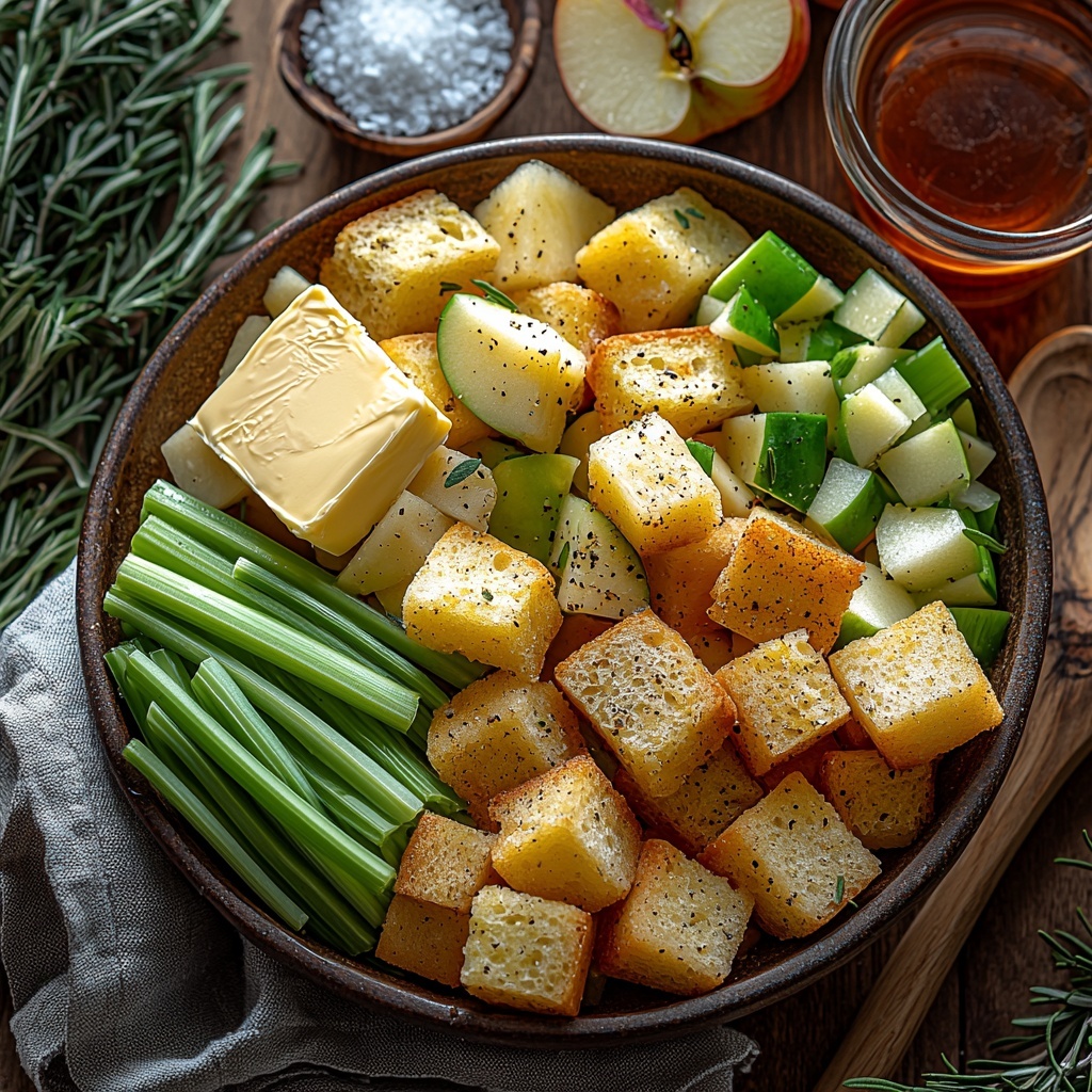 Gathering simple, wholesome ingredients is the key to creating a stuffing that’s bursting with flavor and texture. Each component plays its role: butter adds richness, apples bring a gentle sweetness and moisture, and the sage ties it all together with its aromatic charm.