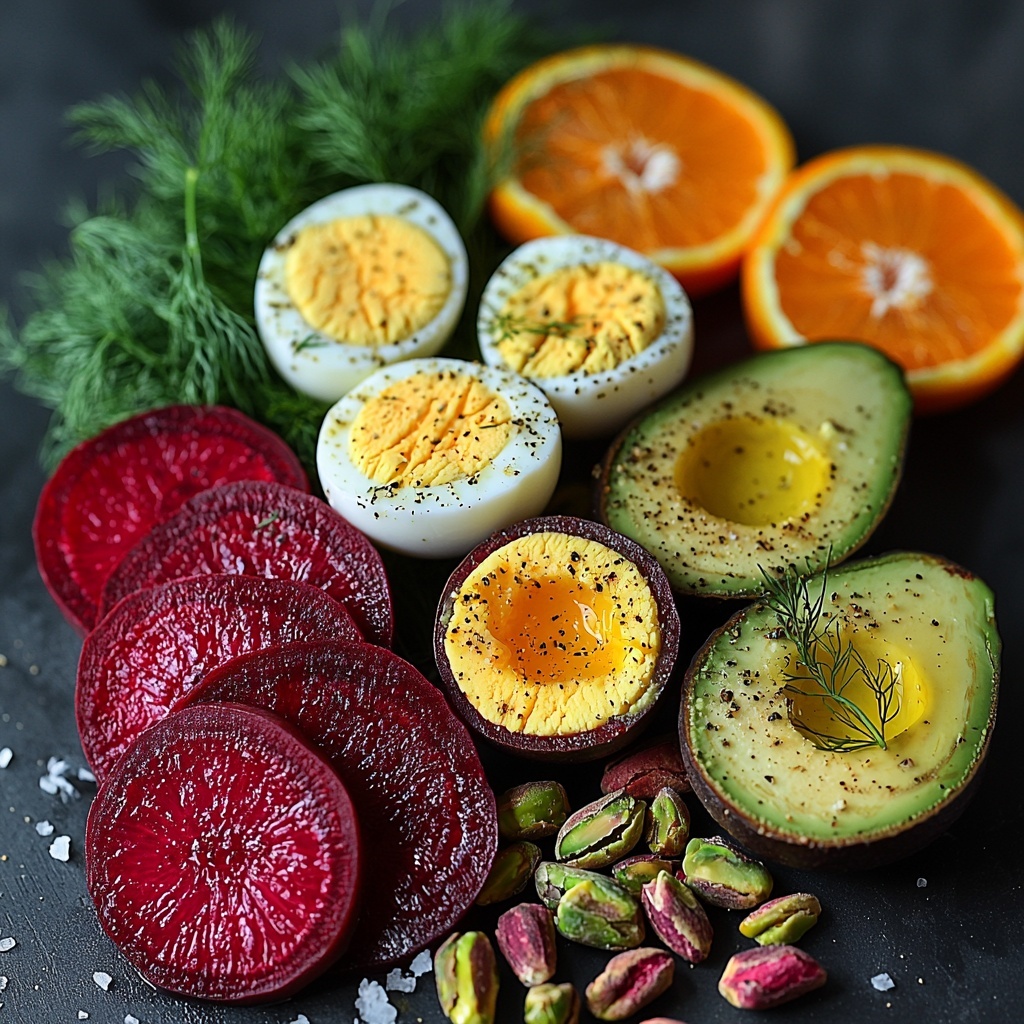 A sophisticated and colorful French-inspired salad featuring tender roasted beets, creamy ripe avocados, soft-boiled eggs with jammy yolks, and fresh citrus segments. This elegant dish is finished with a dollop of luscious crème fraîche, crunchy pistachios, and a fragrant herb garnish, creating a perfect balance of textures and flavors for a light yet indulgent appetizer or side.