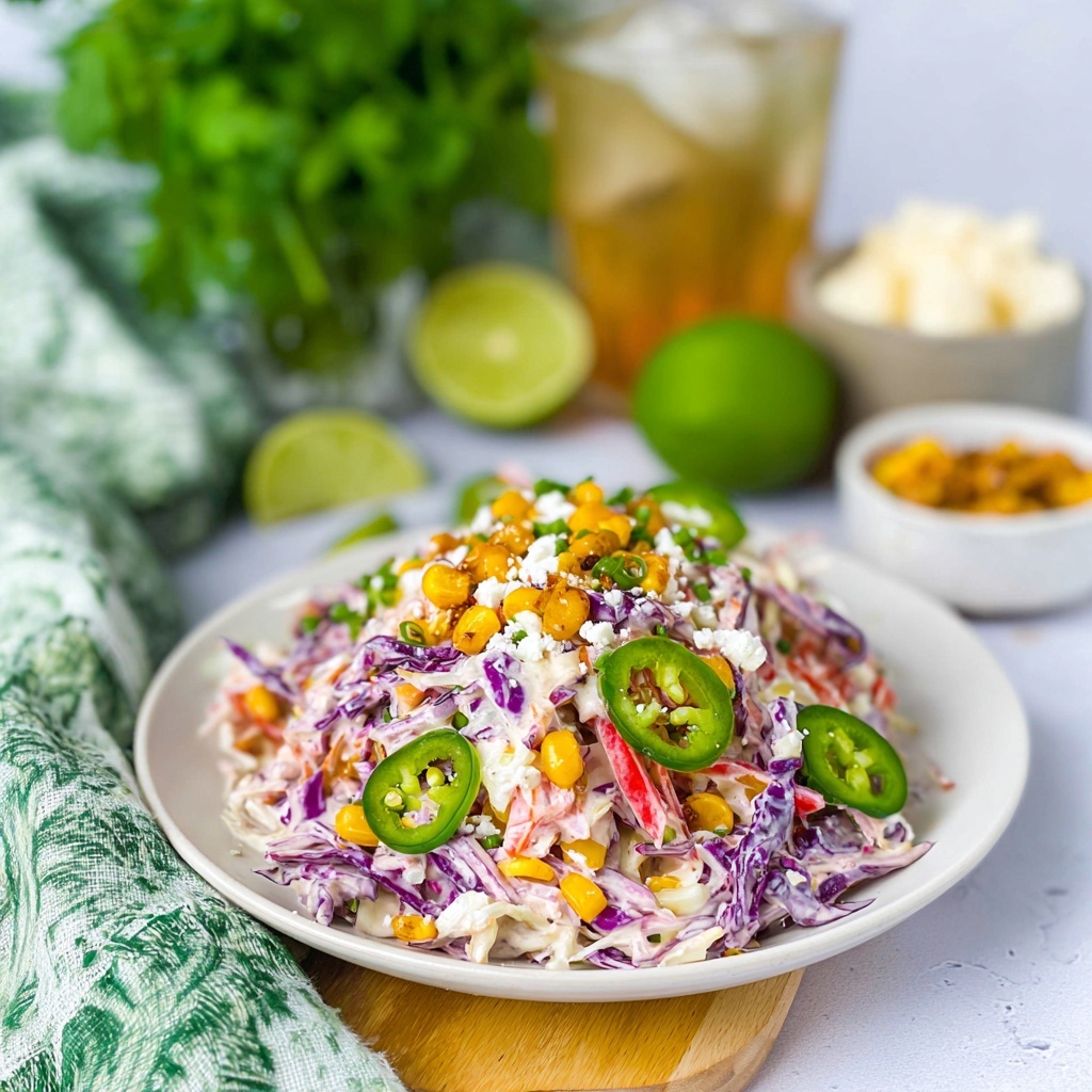 Adding a few extra garnishes can elevate this coleslaw from simple to spectacular. Fresh lime wedges on the side are a wonderful option to squeeze over the top for extra zing. A handful of chopped green onions or more cilantro gives a fresh, herbal brightness, and a dash of smoked paprika sprinkled on top enhances the smoky charm.