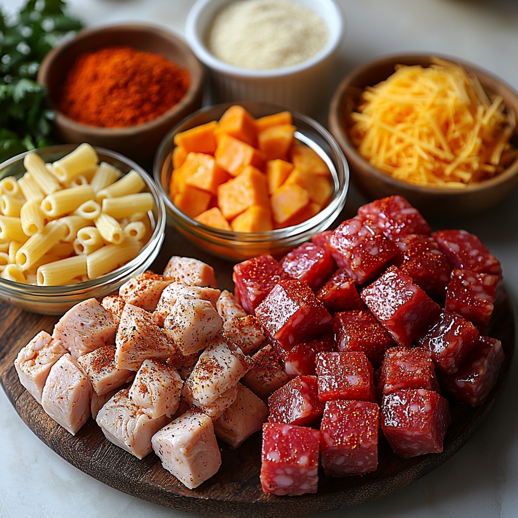 The magic of the One-Pot Creamy Spicy Cajun Chicken & Sausage Mac Recipe lies in its simple yet powerful ingredients. Each component is chosen to build layers of flavor, texture, and color that come together in perfect harmony.