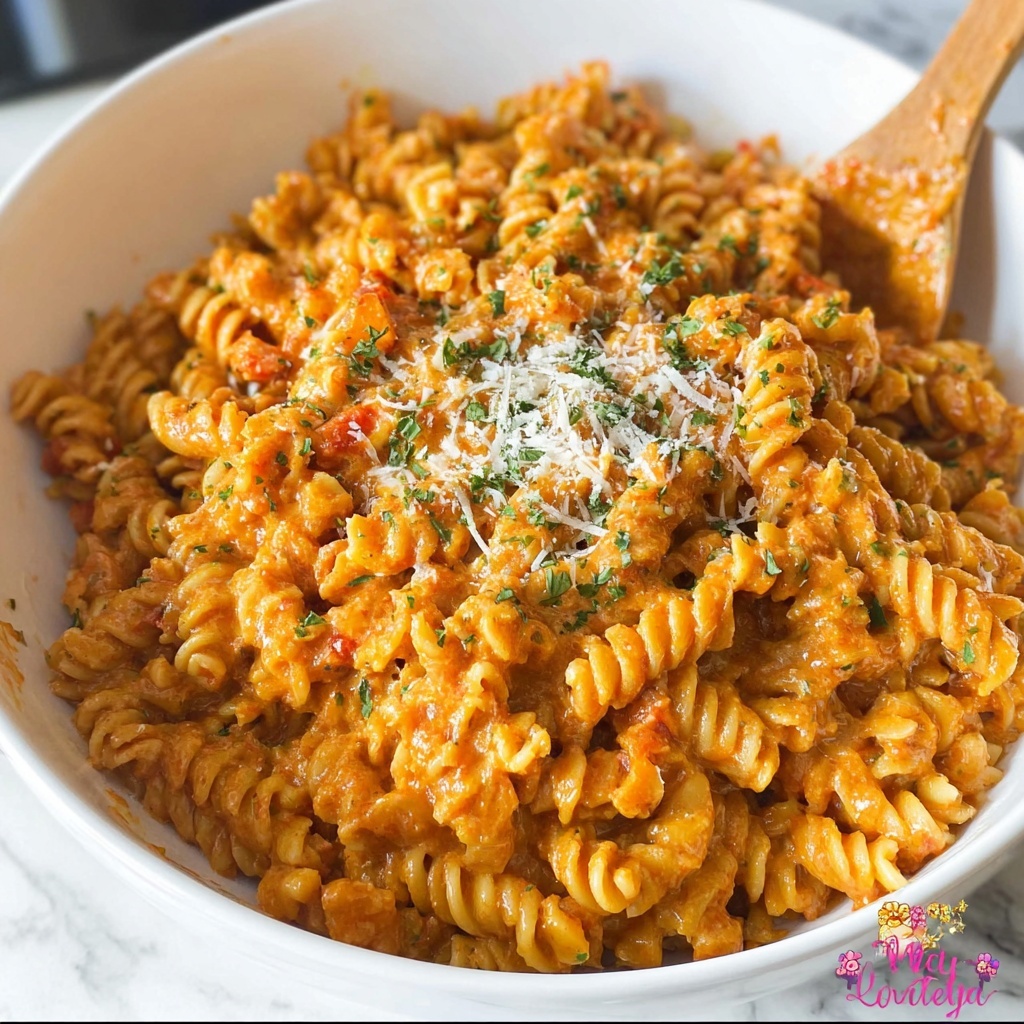 Short pasta shapes such as spirals, bow ties, or penne work best because their curves and nooks hold the creamy tomato sauce beautifully.