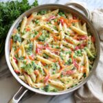 When reheating, do so gently on the stove with a splash of water or olive oil to revive the texture and prevent the pasta from drying out. Microwave reheating works in a pinch but tends to soften the vegetables more quickly, so use short bursts of heat and stir in between.