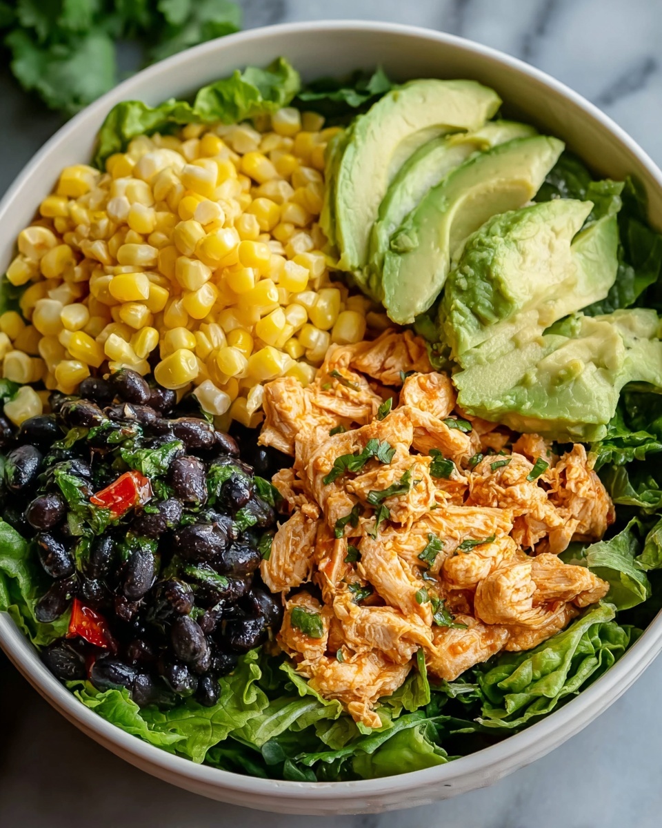 While the chicken is cooking and resting, toss together the romaine lettuce, halved cherry tomatoes, drained corn, rinsed black beans, thinly sliced red onion, and diced avocado in a large bowl. This vibrant mix sets the stage for all the bold elements to come.