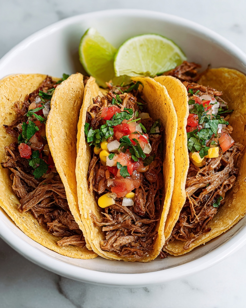Build your tacos by spooning a generous amount of the shredded beef onto each tortilla. Top with fresh diced onions, chopped cilantro, juicy tomatoes or salsa, and creamy avocado slices for a colorful, flavorful experience that captures the essence of this Shredded Beef Tacos Recipe.