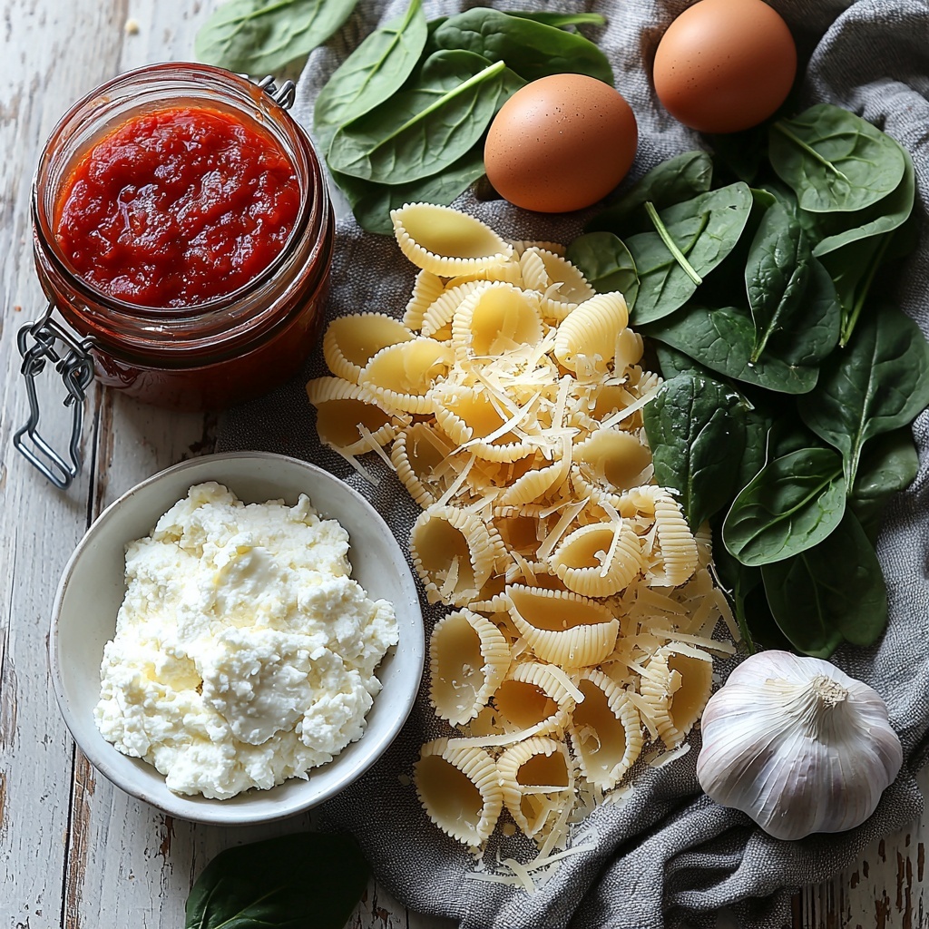 Putting together this Spinach and Ricotta Stuffed Shells Recipe is wonderfully straightforward thanks to a concise list of ingredients. Each plays a crucial role, whether it’s the creaminess of the ricotta, the fresh crunch of spinach, or the savory depth of Parmesan. Together, they create the perfect harmony of flavors and textures.