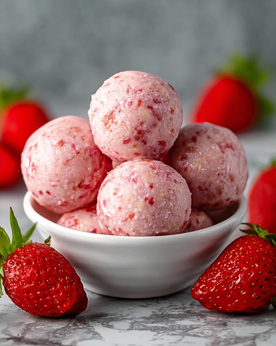 Sprinkle some extra freeze-dried strawberry powder or finely chopped nuts on top for a pop of texture and visual appeal. You can also roll them in shredded coconut or cocoa nibs to switch up the flavor profile and make them even more irresistible.