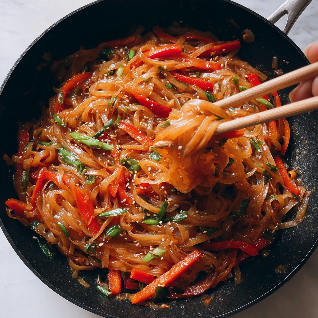 Once everything is well combined and heated through, remove the skillet from heat. Give the noodles a gentle stir to evenly distribute the sauce. The dish should look glossy and inviting, with all the fresh ingredients perfectly mingled.