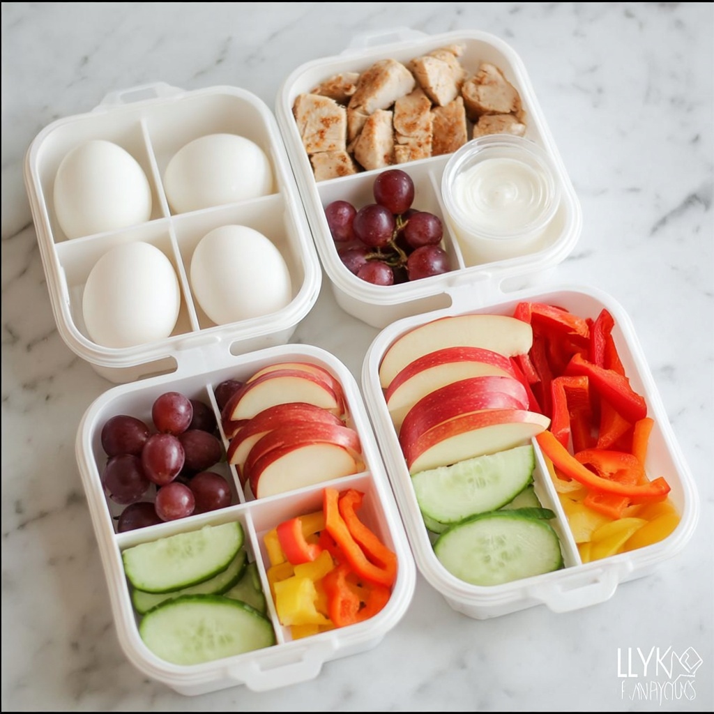 Start by ensuring your chicken is cooked and chopped into bite-sized pieces. Dice the peppers and slice the cucumbers and apples thinly to make them easy to eat on-the-go. Hard boil your eggs until the yolks are firm but creamy, then peel and set aside.